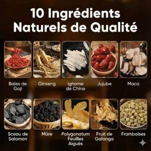 Élaboré selon une formule traditionnelle chinoise à base de ginseng, mûrier, goji, igname chinois, dattes rouges, maca et autres plantes soigneusement sélectionnées, sans aucun additif chimique.